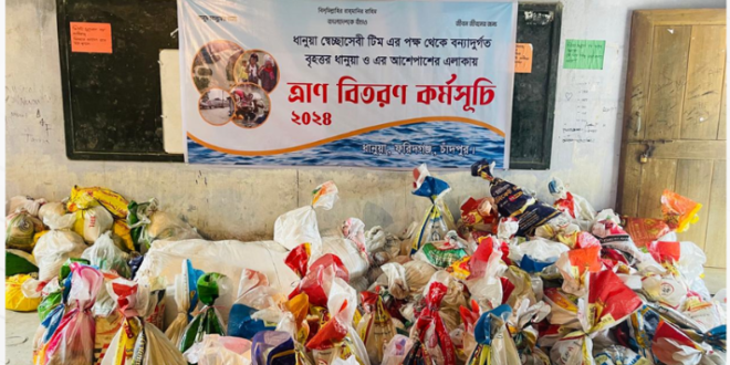 ধানুয়া সেচ্ছাসেবী টিমের পক্ষ থেকে বন্যাদুর্গত ১৫০ পরিবারের মাঝে ভারি