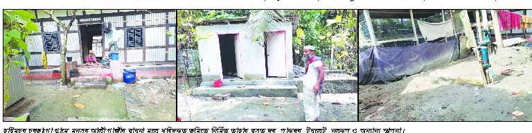 ক্যাপশন: হাইমচর চরভাংগা গ্রামে মনসুর আলী গাজীর বায়না মূলে খরিদকৃত ভূমিতে নির্মিত তাহার বসত ঘর, পাকঘর, টয়লেট, নলকূপ ও অন্যান্য স্থাপনা।