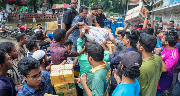দেশের বিভিন্ন জেলায় বন্যার্ত মানুষকে সহায়তা করার জন্য আজ শুক্রবার ঢাকা বিশ্ববিদ্যালয়ের ছাত্র-শিক্ষক কেন্দ্রে (টিএসসি) বৈষম্যবিরোধী ছাত্র আন্দোলনের গণত্রাণ সংগ্রহ কর্মসূচিতে মানুষের ঢল নেমেছে। শিক্ষার্থীদের এই উদ্যোগে অংশীদার হতে নিজেদের সামর্থ্য অনুযায়ী নগদ অর্থ কিংবা ত্রাণসহায়তা পৌঁছে দিতে আসেন বিপুলসংখ্যক মানুষ।