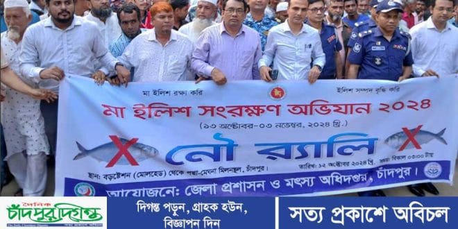 মা ইলিশ সংরক্ষণ অভিযান বাস্তবায়নে চাঁদপুরে র্যালী ও সচেতনতামূলক সভা অনুষ্ঠিত হয়েছে। গতকাল শনিবার ১২ অক্টোবর বিকেলে শহরের তিন নদীর মোহনা মোলহেডে জেলা প্রশাসন ও জেলা মৎস্য অধিদপ্তর এই সভার আয়োজন করে।