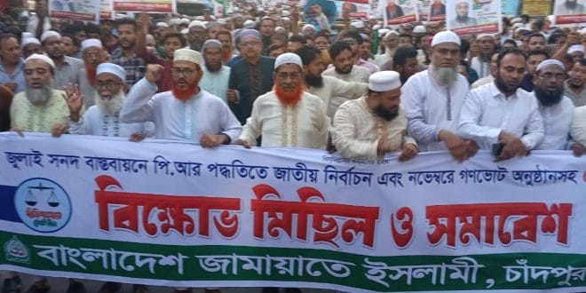 জুলাই সনদ বাস্তবায়ন, পিআর পদ্ধতিতে জাতীয় নির্বাচন এবং নভেম্বরে গণভোট অনুষ্ঠানসহ ৫ দফা দাবীতে বাংলাদেশ জামায়াতে ইসলামী চাঁদপুর জেলা শাখার উদ্যোগে বিক্ষোভ মিছিল ও সমাবেশ অনুষ্ঠিত হয়েছে।