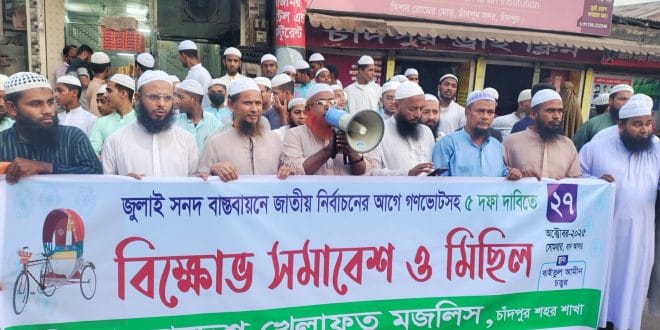 জুলাই সনদ বাস্তবায়নে জাতীয় নির্বাচনে আগে গণভোটসহ ৫ দাবিতে বাংলাদেশ খেলাফত মজলিস চাঁদপুর জেলা শাখার আয়োজনে বিক্ষোভ সমাবেশ ও মিছিল বের করা হয়েছে। ২৭ অক্টোবর সোমবার বিকেলে চাঁদপুর শহরের বাইতুল আমিন জামে মসজিদের সামনে এই বিক্ষোভ কর্মসূচি পালন করা হয়।
