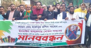 ফরিদগঞ্জে ধানের শীষের প্রার্থী হারুনুর রশিদের বিরুদ্ধে কটূক্তির প্রতিবাদে মানববন্ধন।