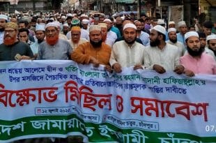 চাঁদপুরের সর্বজন শ্রদ্ধেয় আলেমে দ্বীন ও খতিব মাওলানা আ.ন.ম. নুরুর রহমান মাদানী হাফিজাহুল্লাহ’র উপর মসজিদে পৈচাষিক হামলার প্রতিবাদে সন্ত্রাসীদের দৃষ্টান্তমুলক শাস্তির দাবীতে জামায়াতে ইসলামী চাঁদপুর শহর শাখার উদ্যোগে বিক্ষোভ মিছিল …
